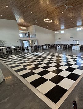 8ft Rectangle Tables, 32" cocktail tables, 60" round tables, black and white checkered dance floor