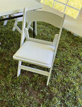 White Resin Chairs, Black Metal Chairs, 6’ Rectangle Table