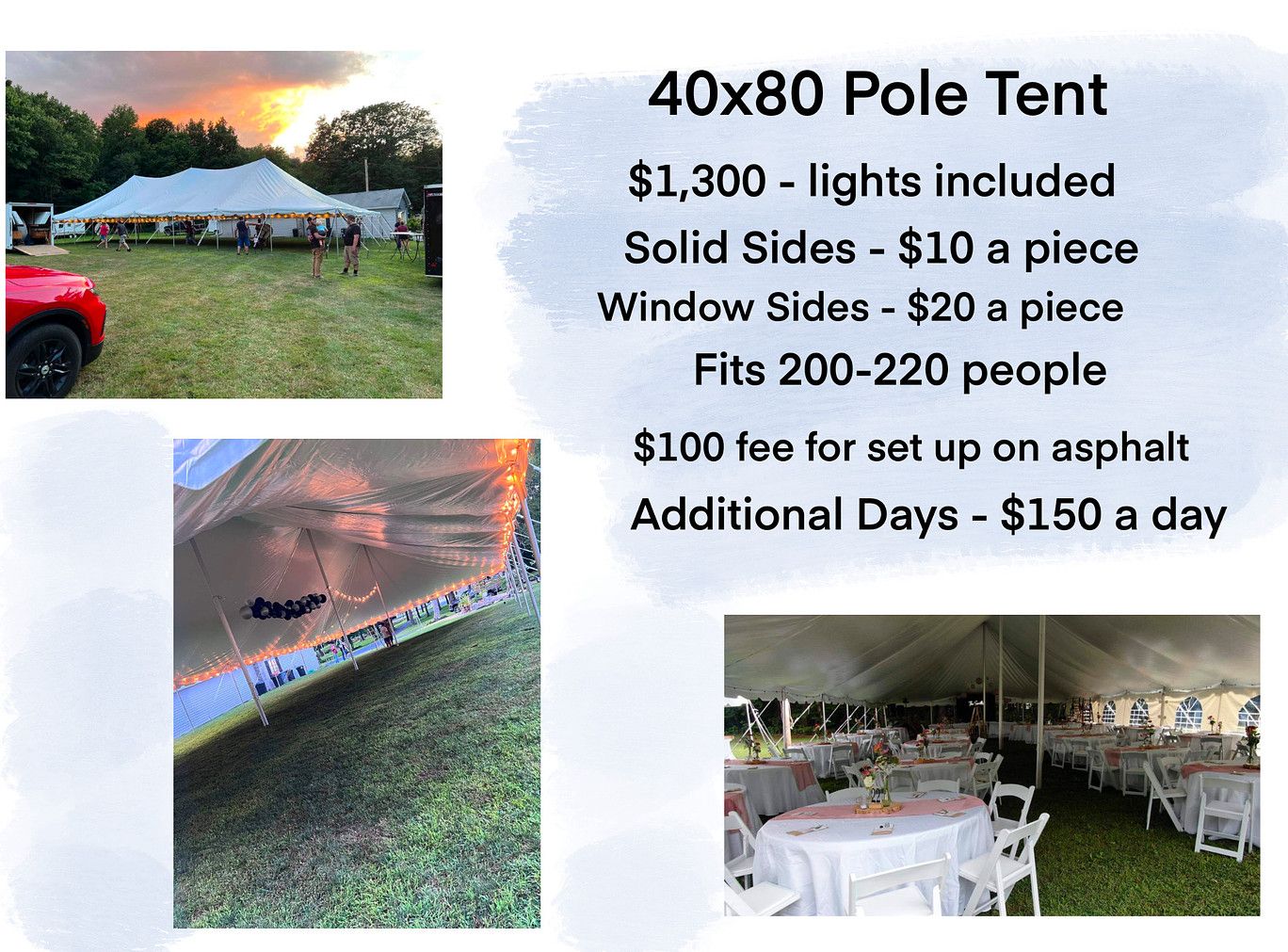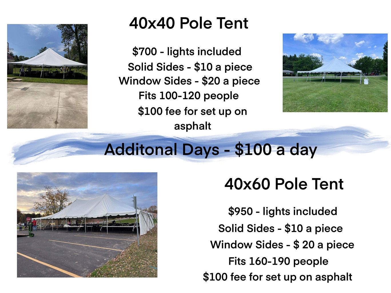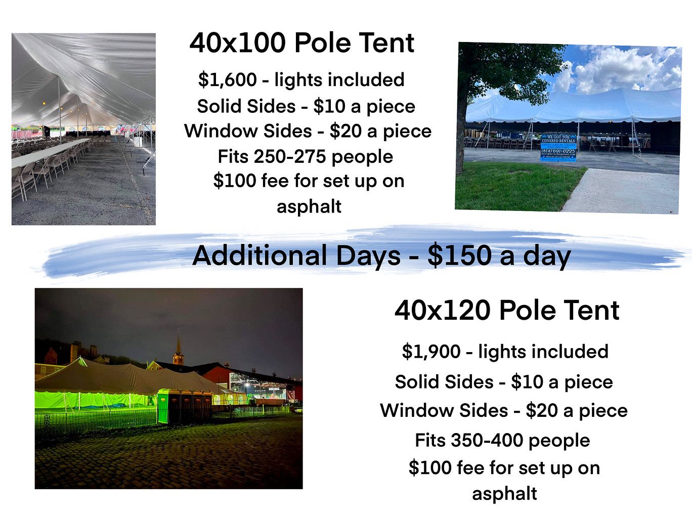 Our professional team provides efficient tent installation and removal services, ensuring your event space is set up and taken down on schedule. We handle all aspects of tent setup, including securing the structure and incorporating any custom configurations you may need with tables and chairs. Additional fees will be added for sides, asphalt setup and additional days.